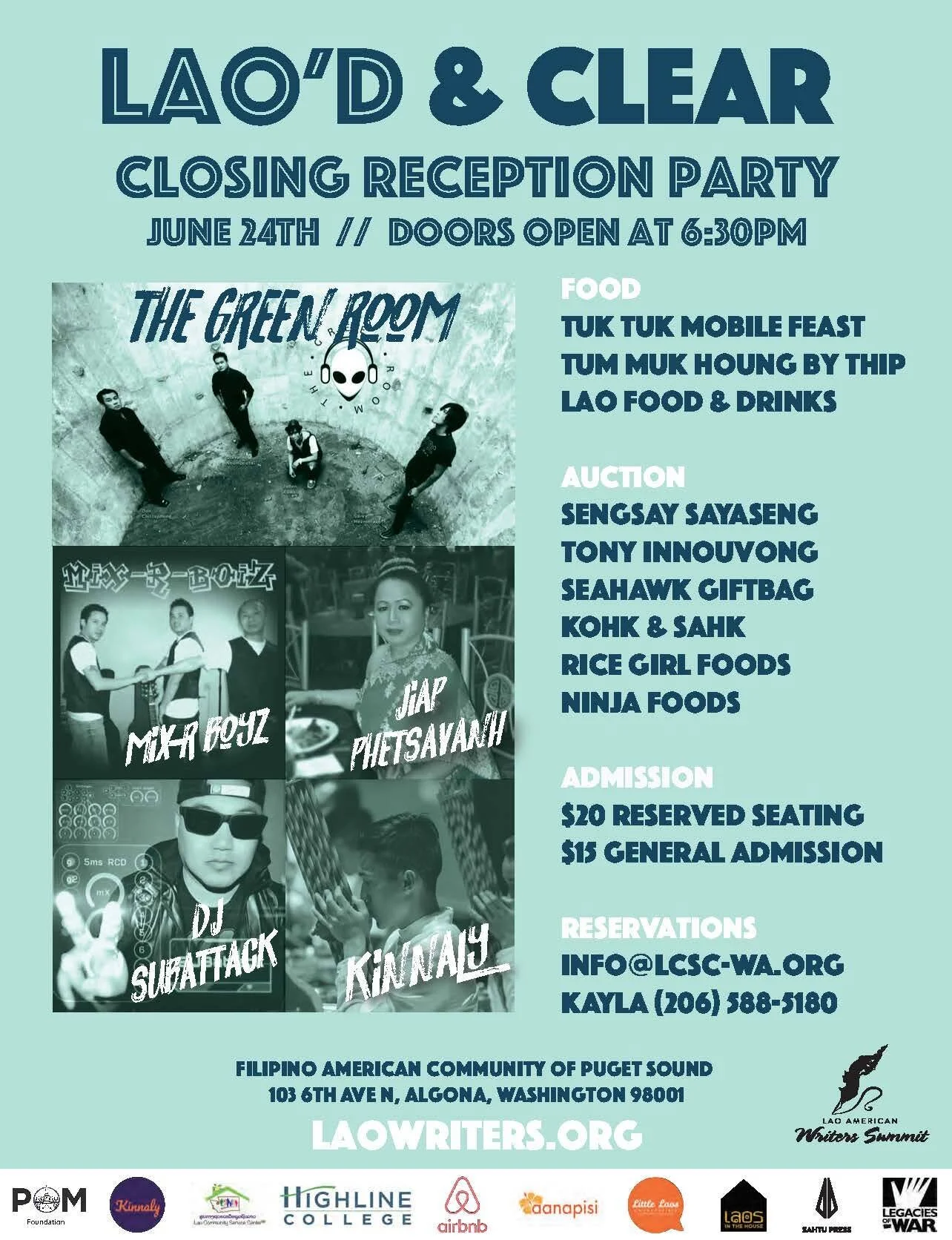 Somvilay gave special thanks to volunteers, artists, presenters and performers for their time; the Seattle planning team who worked countless hours in making the event come true; Phon Khampradith for forming the planning team; Sakuna Thongchanh for bringing the vision based on her trip to the San Diego LAWS and for working with Khampradith to write a grant for the event; the Lao Community Service Center for their sponsorship & cash donation; Ekk Sisavatdy, program director of the Asian American and Native American Pacific Islander-Serving Institution for getting Highline College to provide the space for the event and also a cash donation for supplies; Kathy Thaviseth and Katherina Poupee Vongphrachanh for their marketing and contacting artists and presenters; Nor Sanavonsay for helping with fundraising; the national team for helping with marketing & bringing in artists; and Airbnb for sponsoring the housing for out-of-town artists and presenters.