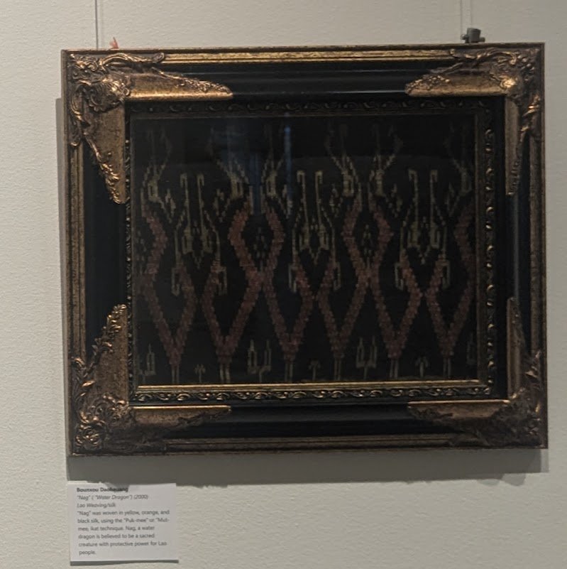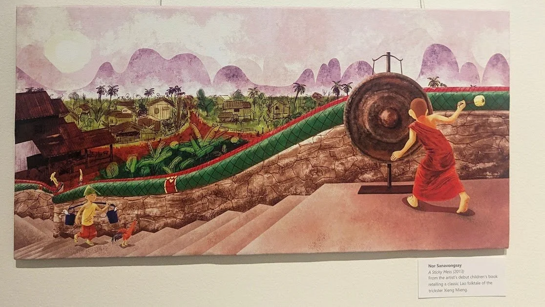 One of the highlights of the exhibit is original art by over a dozen Laotian American creators including those born in Laos, the refugee camps, and the US. Some had formal training, others learned from their elders or were self-taught, but each one has demonstrated a distinctive approach to expressing Laotian American culture as it has been, as they see it today, and what it can become.