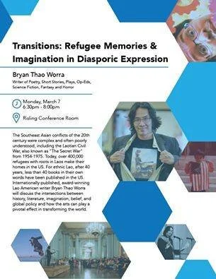Award-winning Lao American writer Bryan Thao Worra will be speaking at UC Davis on Monday, March 7th for one night only. Be sure to catch him if you can! He’ll have copies of the Sahtu Press edition of Tanon Sai Jai and other books available. He’ll be speaking on the subject of transitions, refugee memories and imagination in diasporic expression.